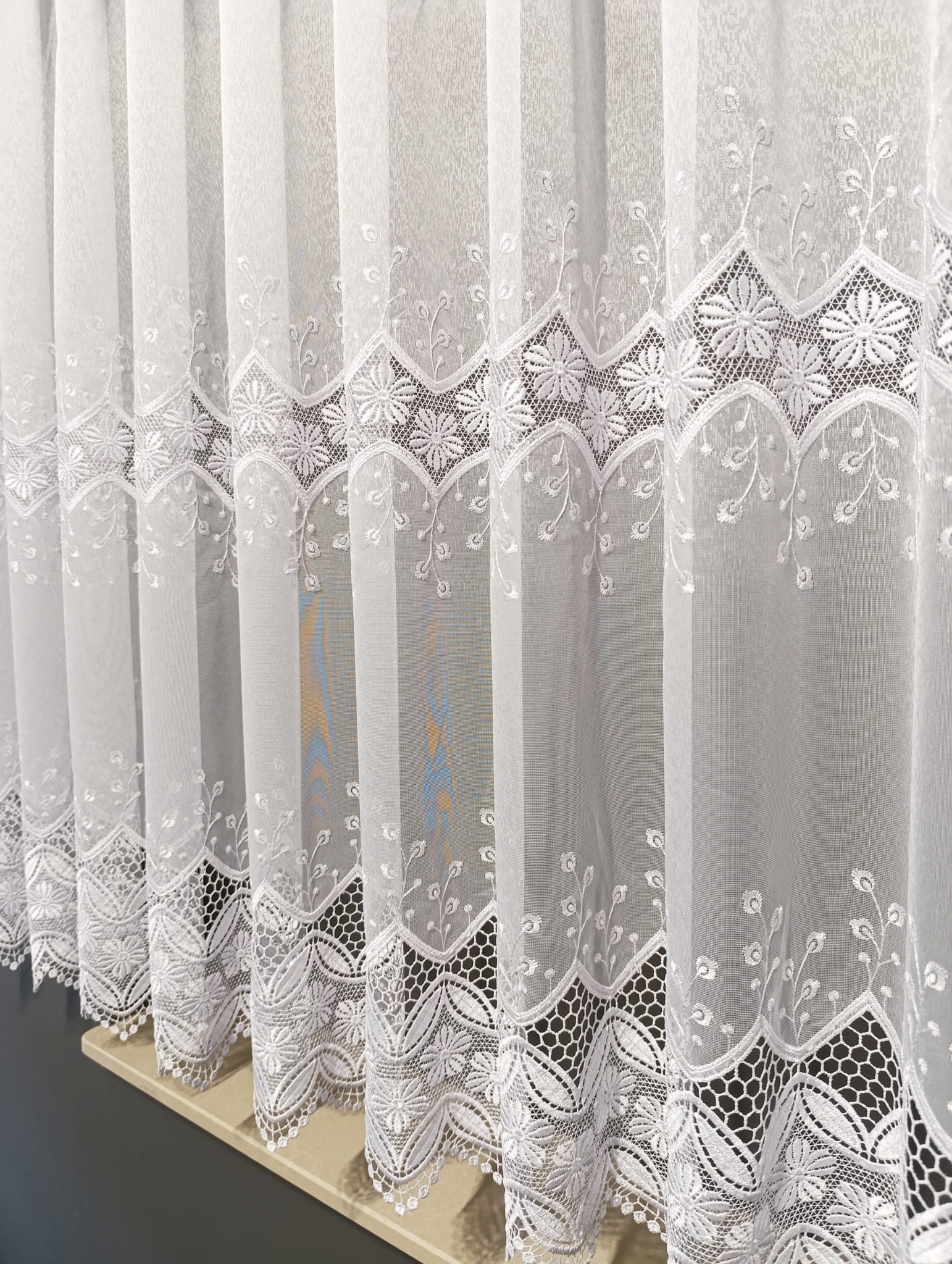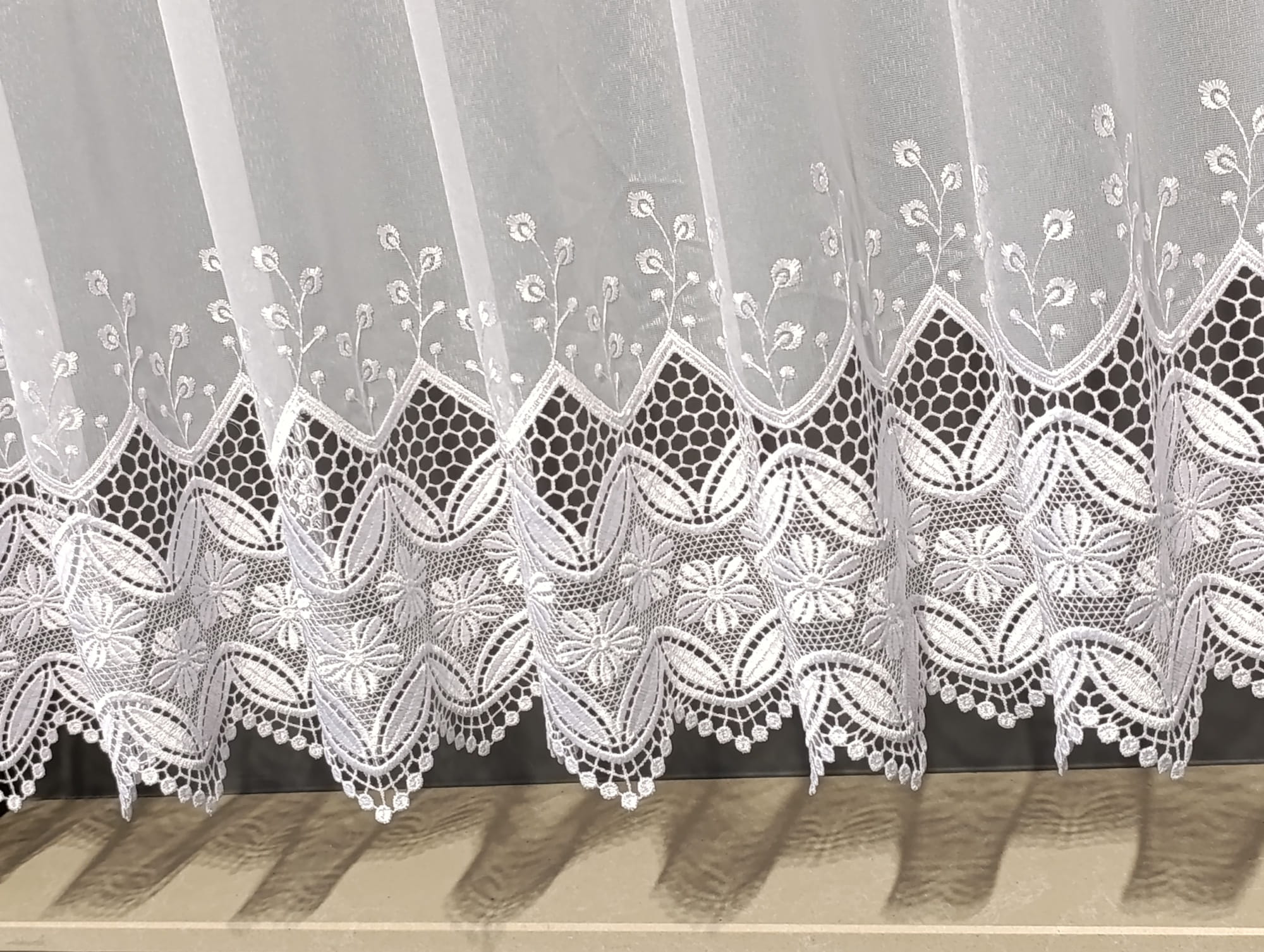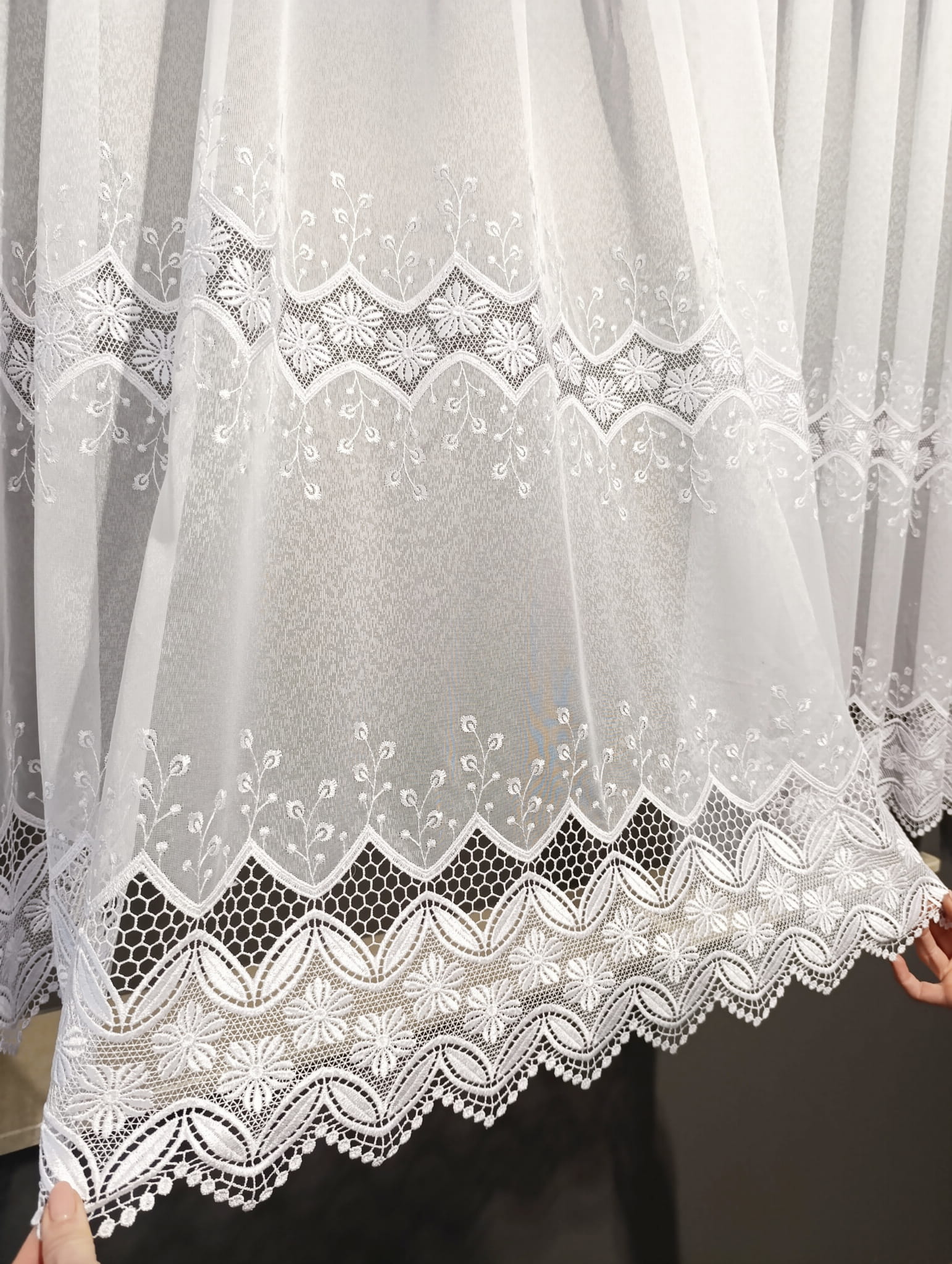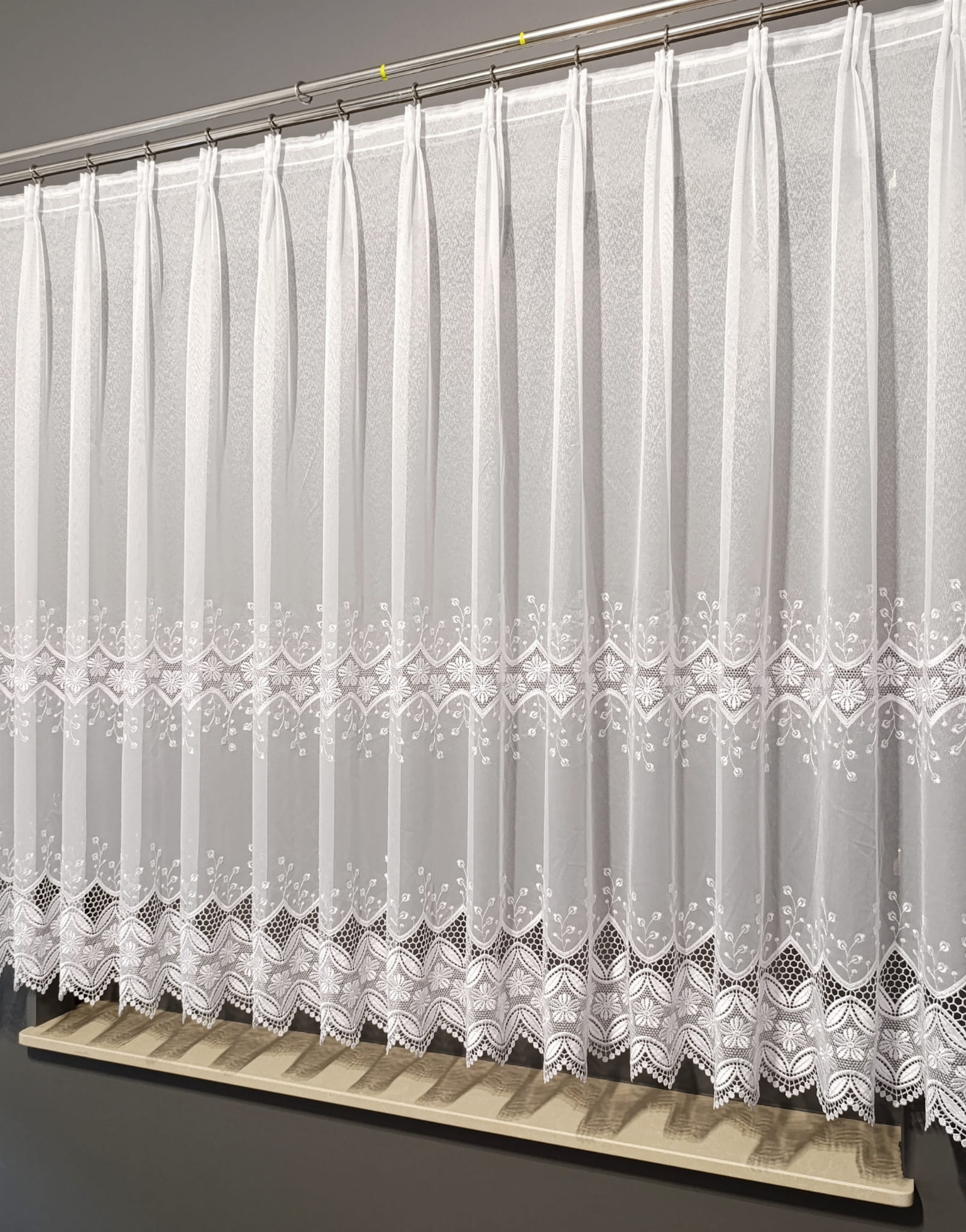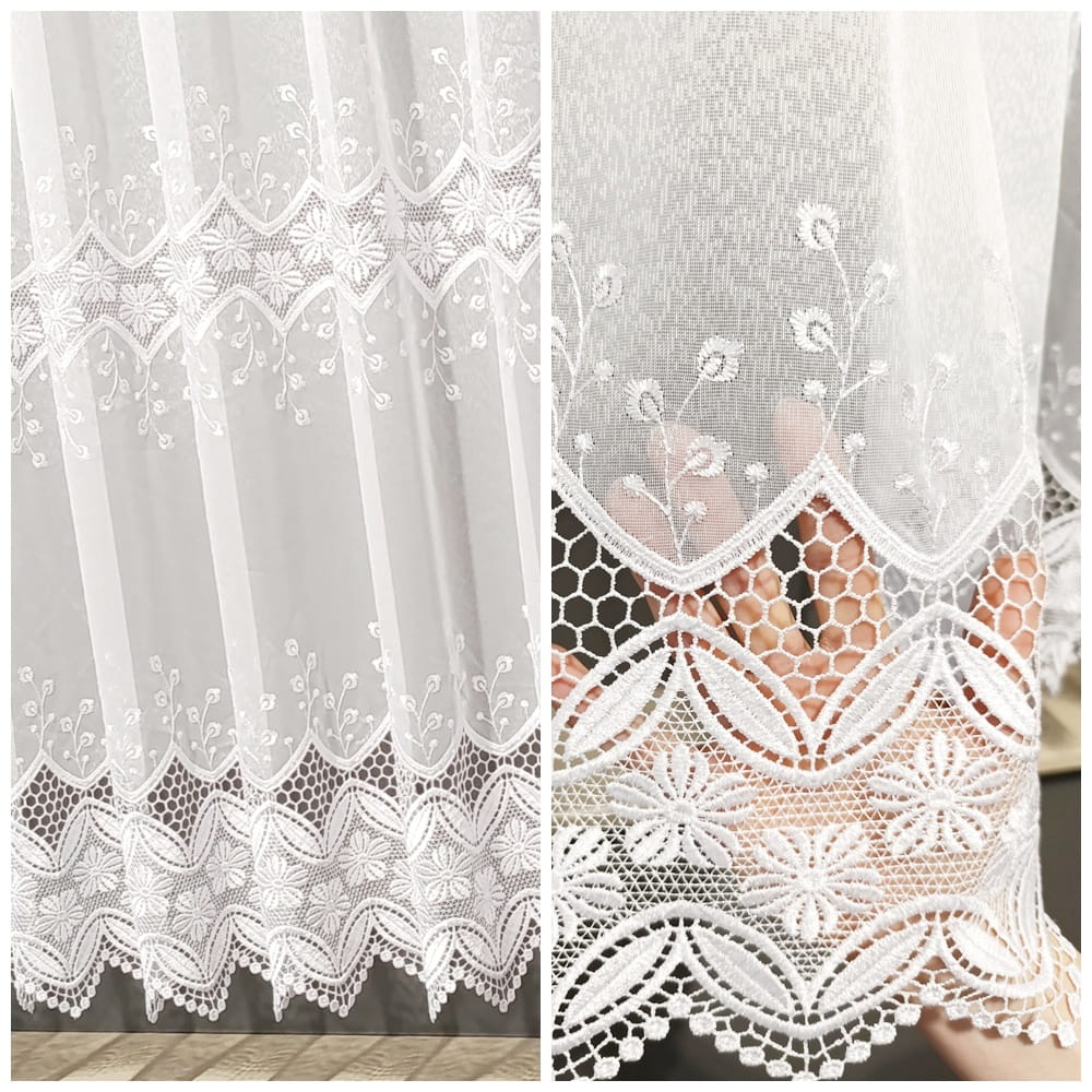 • Firana z dwoma szlakami bardzo ładnej gipiury. Gipiura nie pruje się się po praniu, co ma miejsce w tanich chińskich firanach gipiurowych.