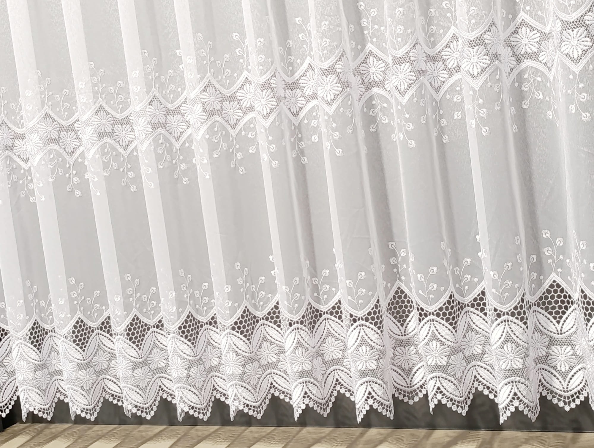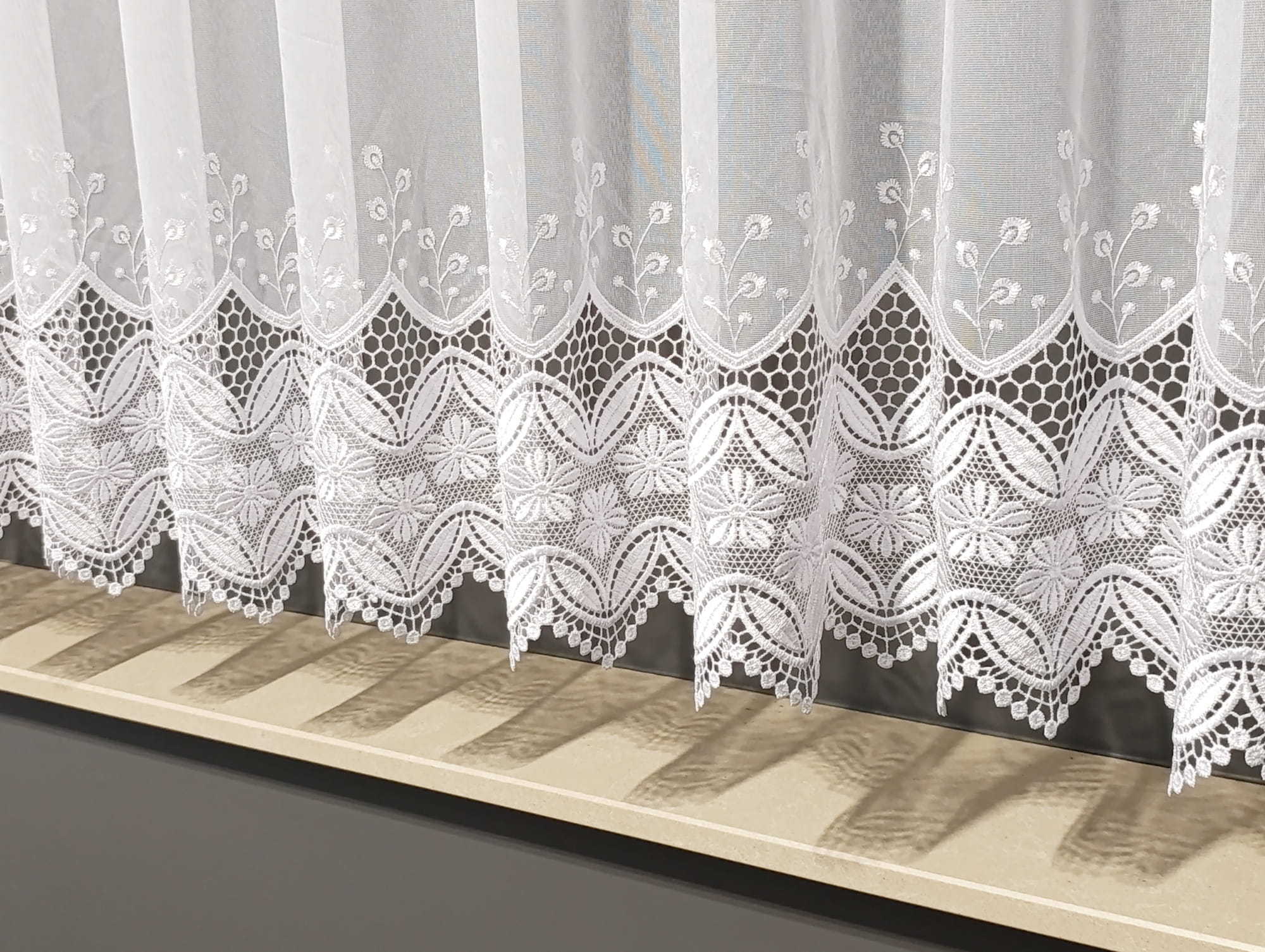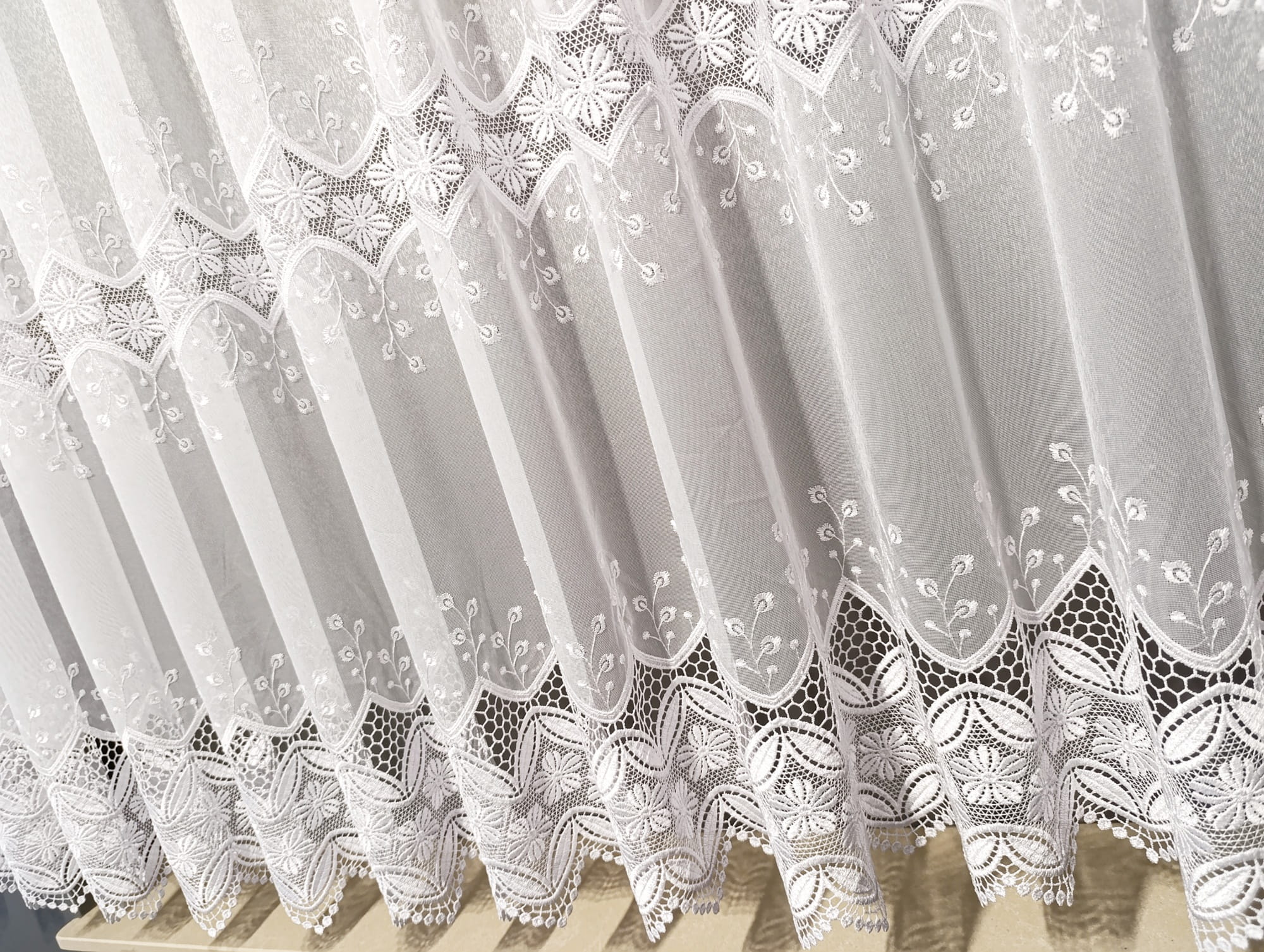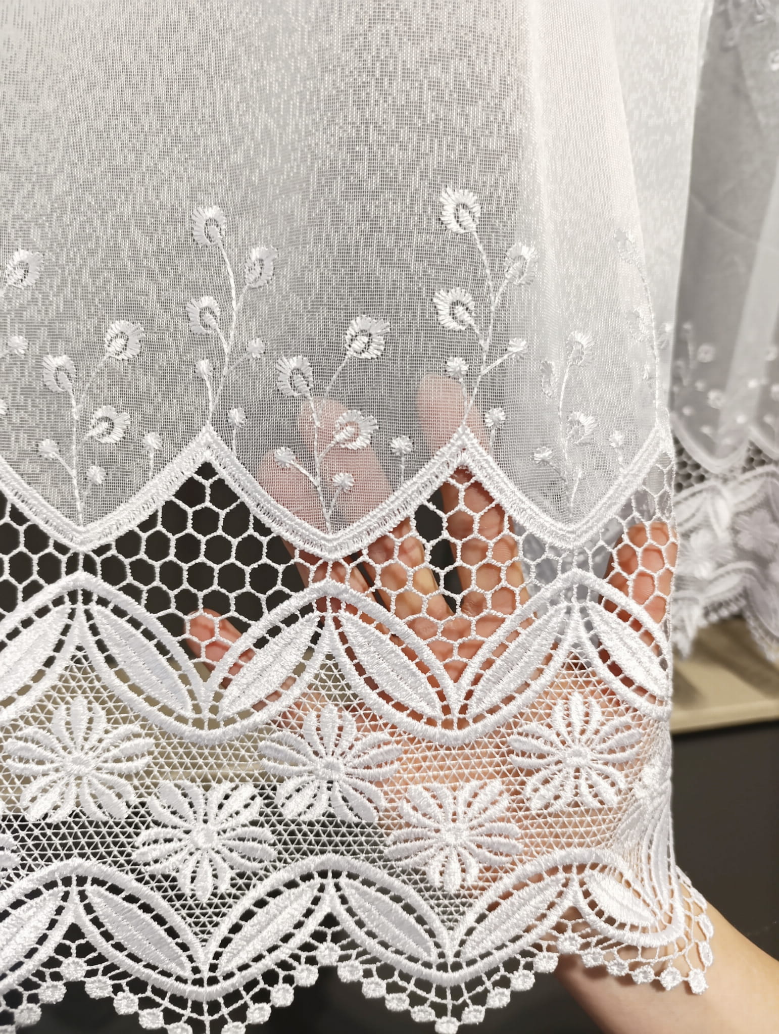 • Firana z dwoma szlakami bardzo ładnej gipiury. Gipiura nie pruje się się po praniu, co ma miejsce w tanich chińskich firanach gipiurowych.