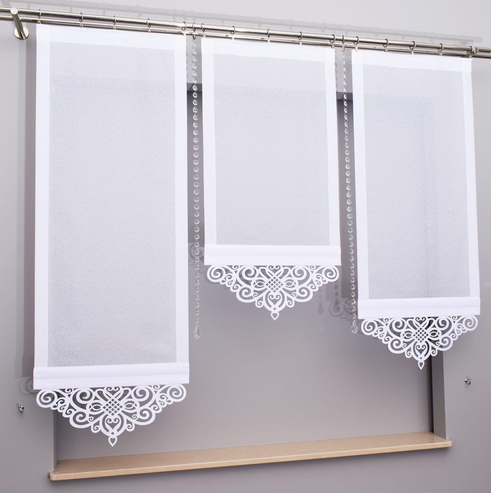 - Każdy ekran posiada wszytą taśmę co pozwala nam wpiąć agrafki lub zawiesić na tradycyjnych żabkach.