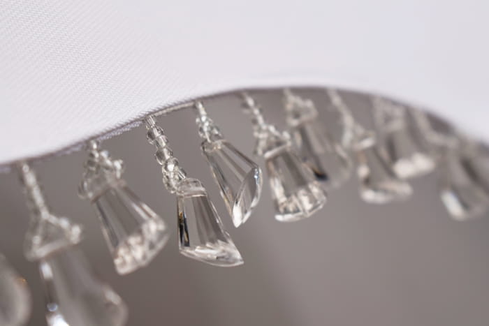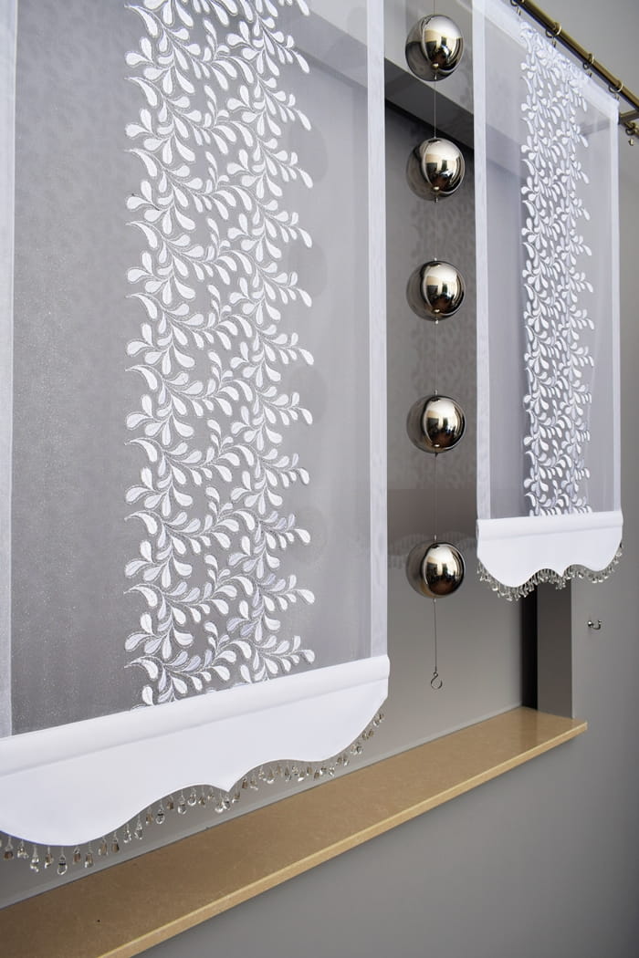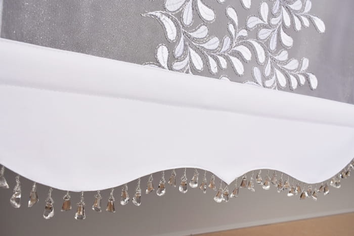 - Dół firany wykończony ozdobną wstawką w dowolnym kolorze z wszytymi kryształkami.(poinformuj nas jaki kolor wstawki został wybrany) na zdjęciu pokazany jest kolor biały.