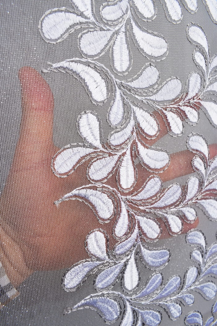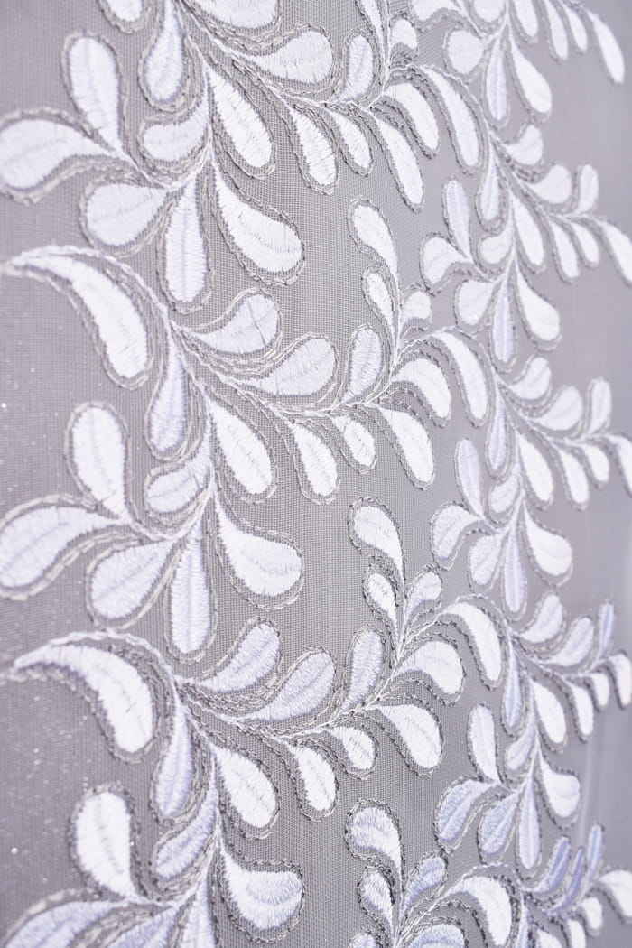 - Materiał w kolorze bieli z delikatnie haftowaną szarą nitką lub cały biały.