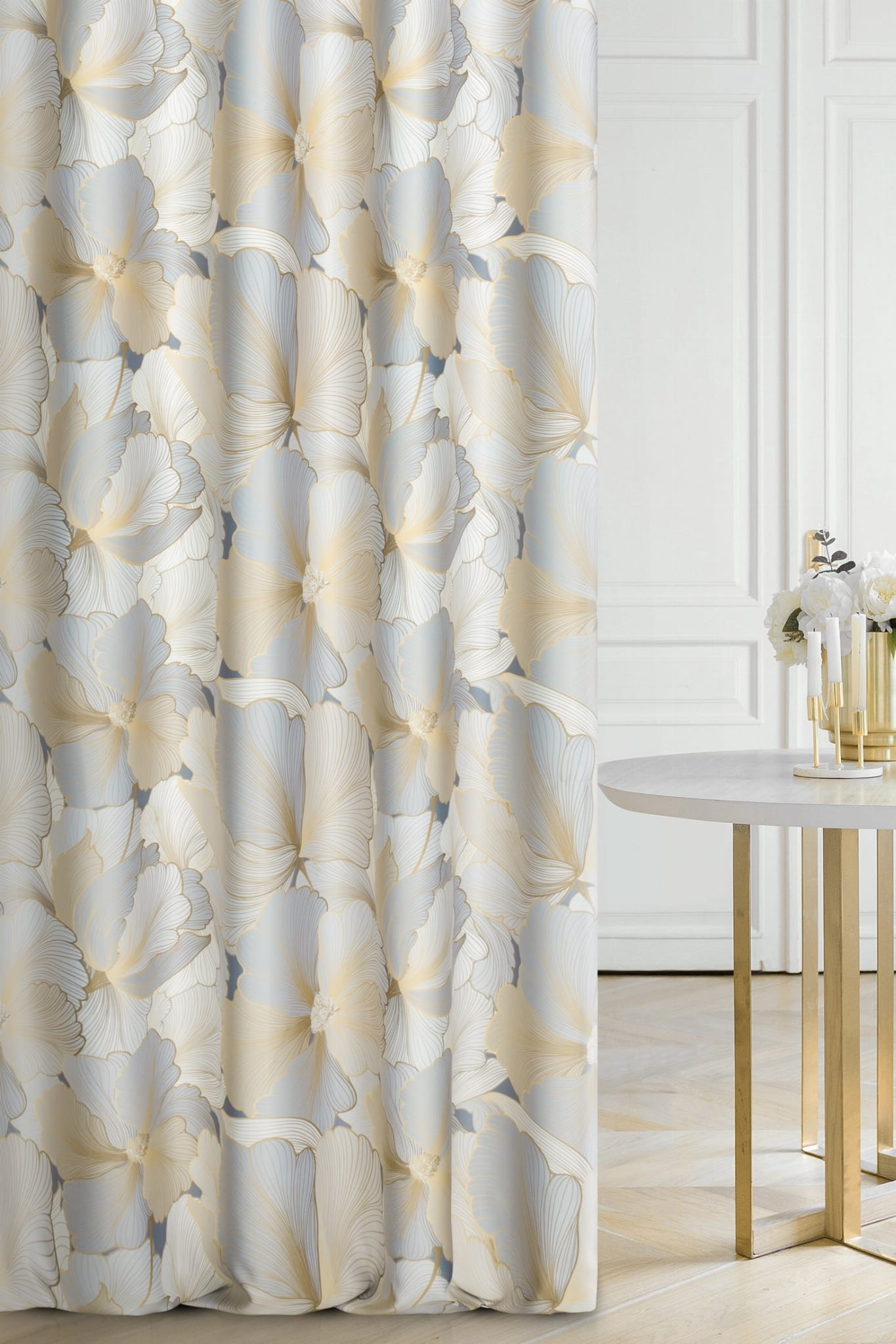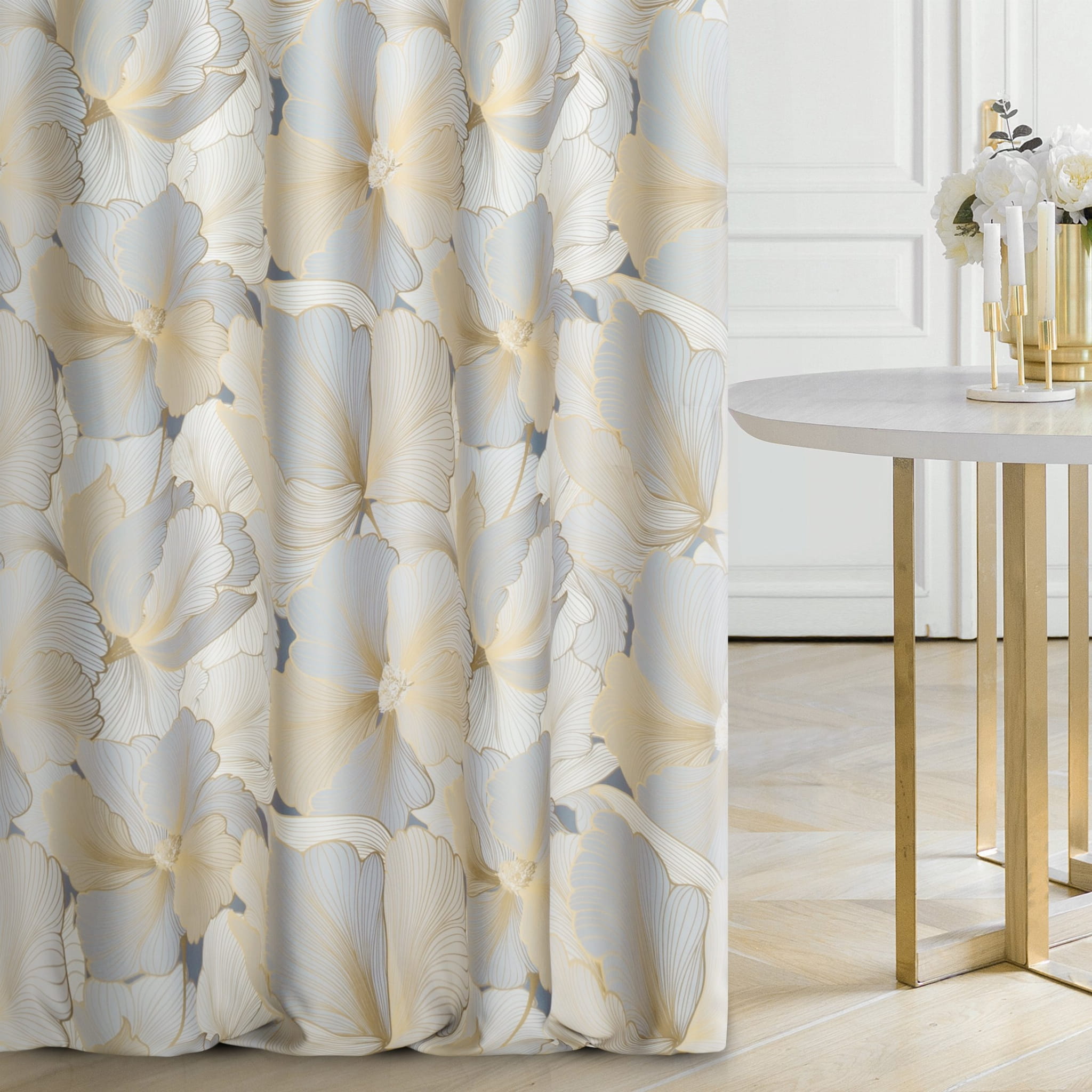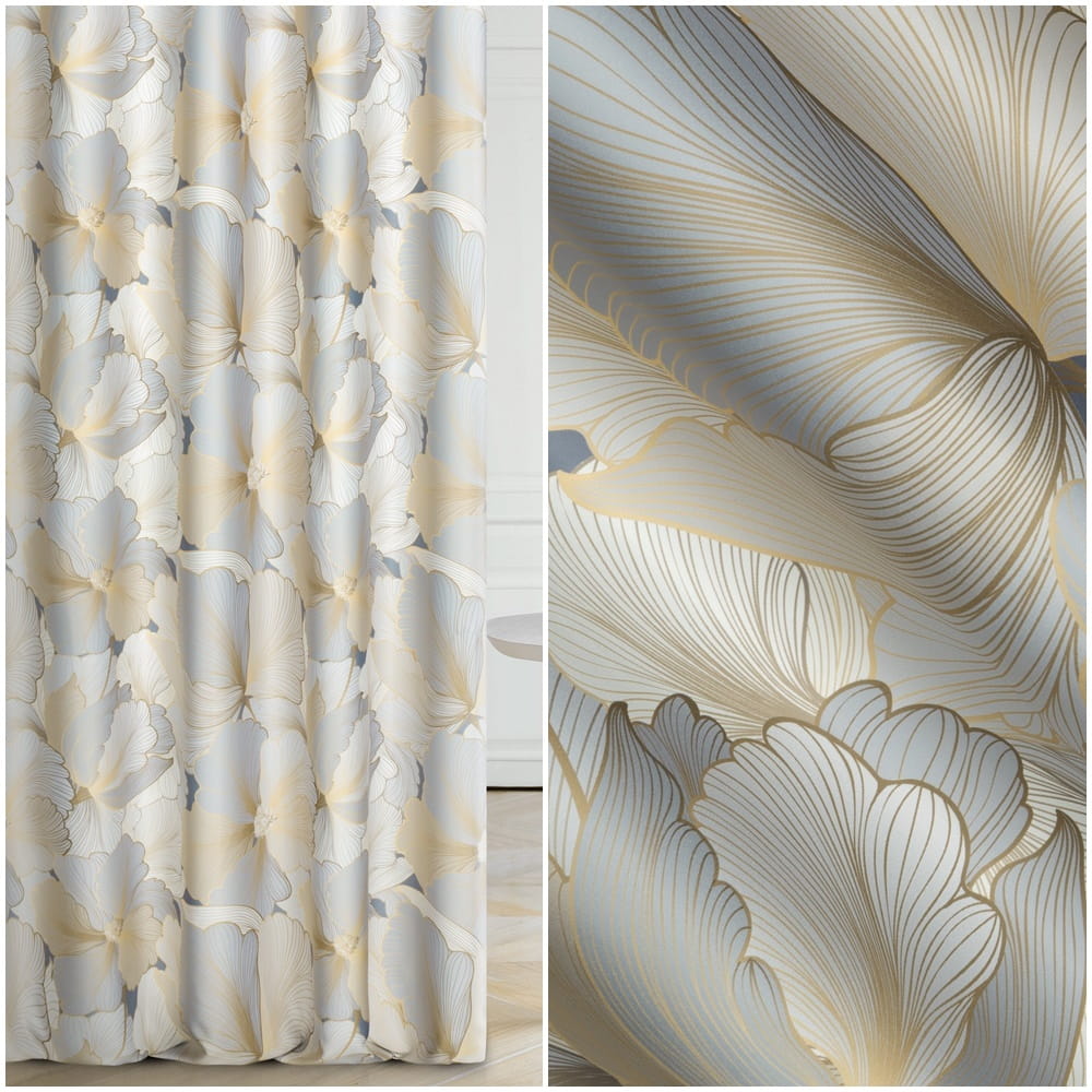 - Zasłona wzór KWIATOWY, w odcieniach złoty, krem, szary.