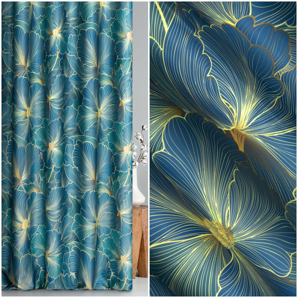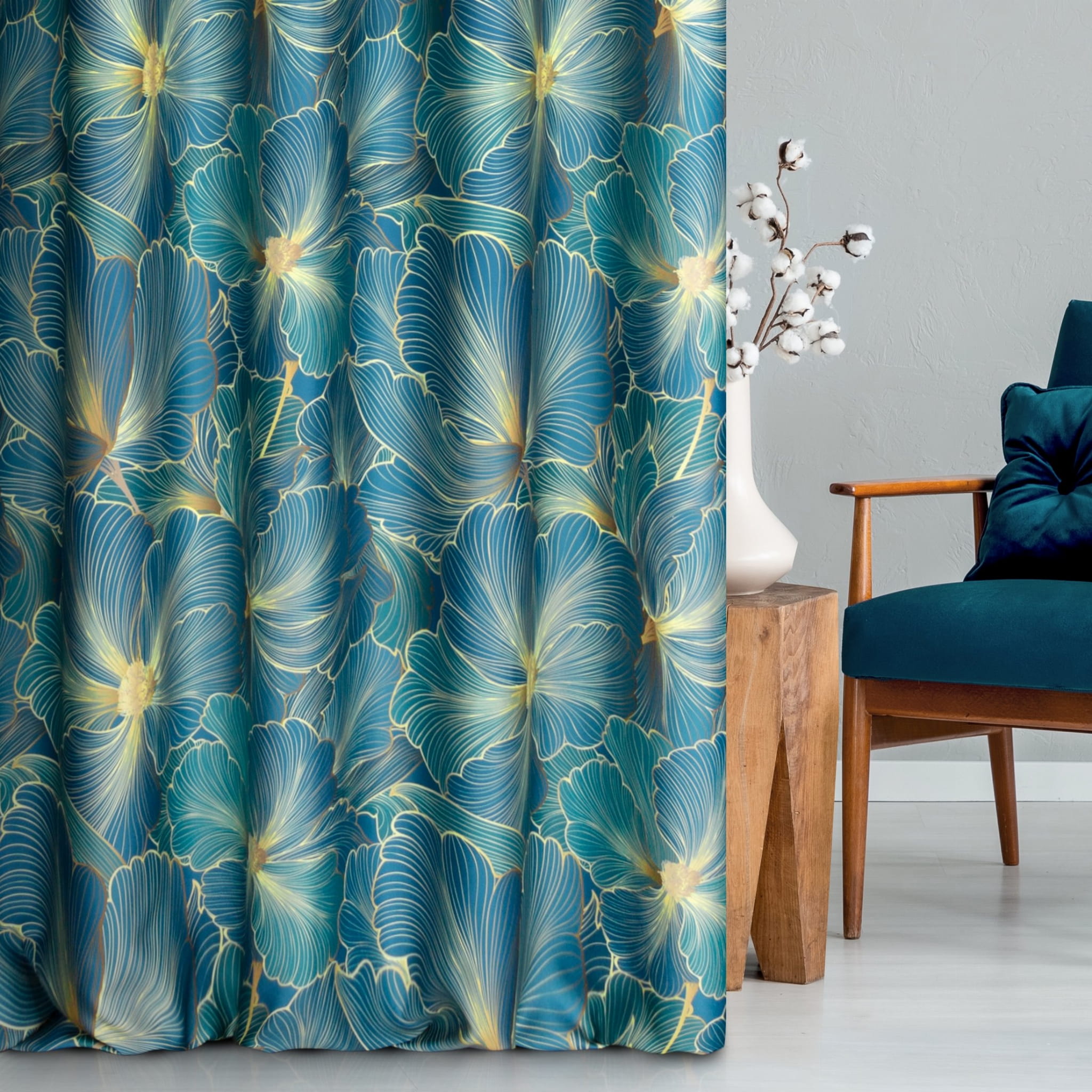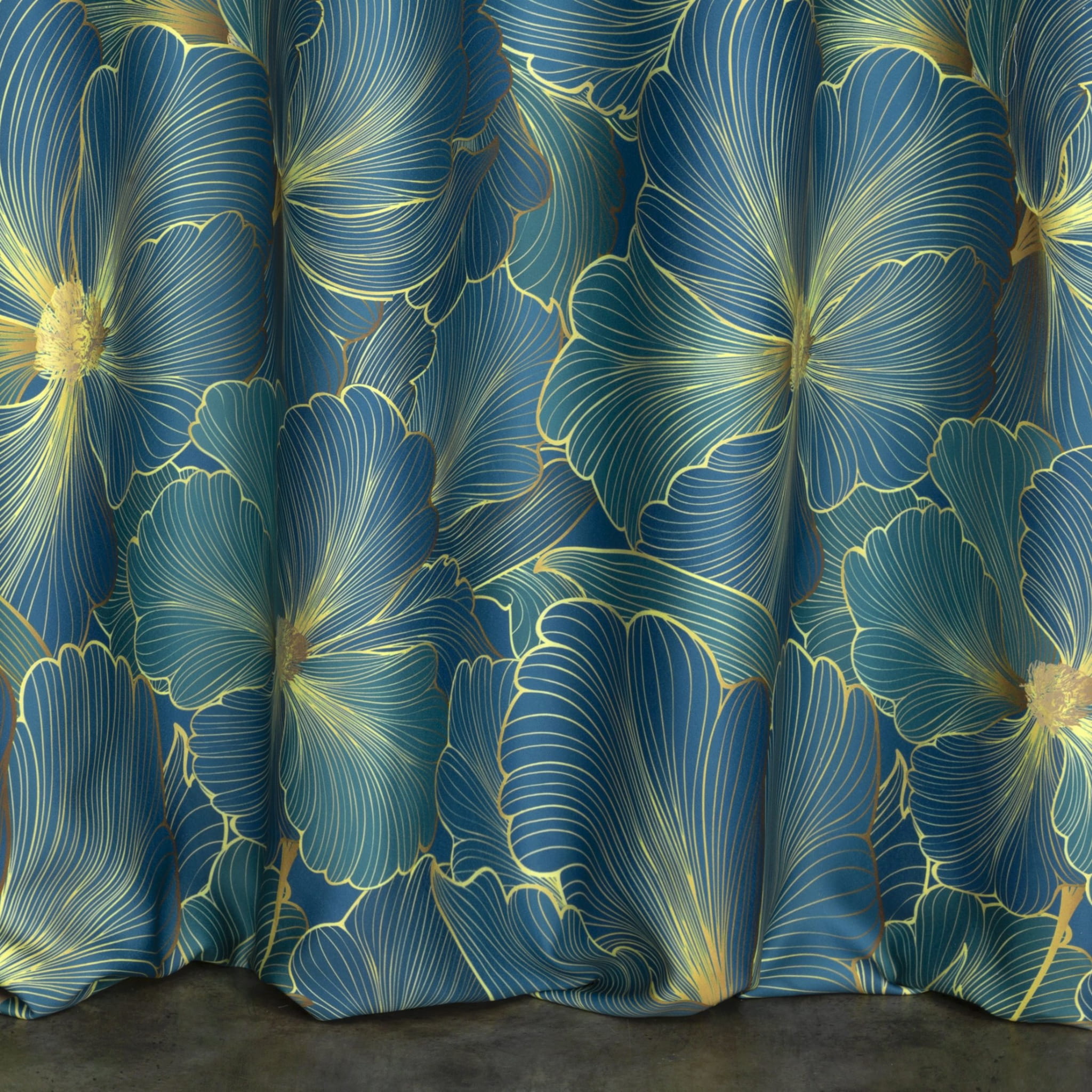 - Zasłona wzór KWIATOWY, w odcieniach turkusu i ciemnego niebieskiego.